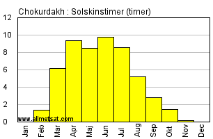 | Månedlig gennemsnitlige antal solskinstimer om dagen. |