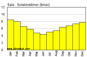 | Månedlig gennemsnitlige antal solskinstimer om dagen. |